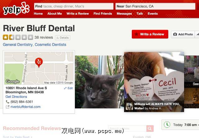 Dr。明尼苏达州牙医兼奖杯猎人沃尔特·帕尔默(Walter Palmer)违反了津巴布韦法律,杀死了一位旅游者最爱的狮子,因此一直受到不断袭击Yelp和其他诽谤其个人和业务的站点的攻击。 (许多企业受到负面评论的攻击,而这些评论与企业的服务或产品无关。)