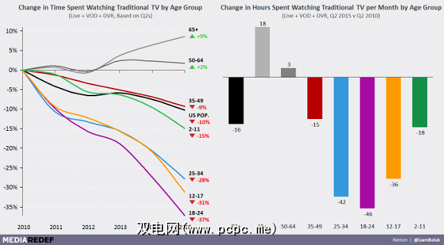 3。几乎每个年龄段的电视观众都较少。在2015年第二季度,一个月内最多观看电视节目的年龄段是50至64岁和65岁以上,这意味着2至49岁的人群收看更少的电视。