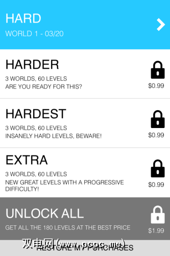 该游戏可从App Store免费下载,但您只能访问第一组级别。您可以以$ 0.99的价格购买Harder,Hardest和Extra级套件,也可以以$ 1.99的价格购买所有套件。