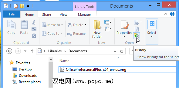 启用文件历史记录后,只需单击曾经包含文件的文件夹中功能区上的“历史记录"按钮,即可开始恢复文件。