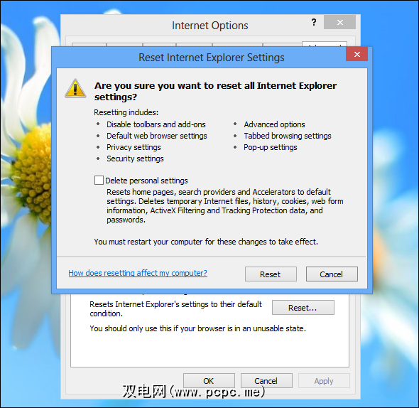 幸运的是,Internet Explorer提供了一种将其重置为默认状态的方法。 。为此,请打开Internet Explorer,单击齿轮图标,选择“ Internet选项",单击“高级"选项卡,然后单击“重置"。