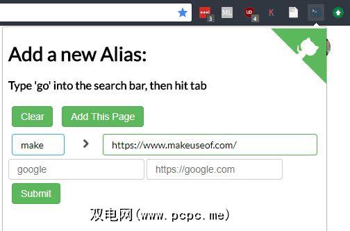 安装后,单击Chrome右上角的图标。在左侧框中输入关键字,然后在右侧输入网站地址。在我们的测试中,这很挑剔。当我们输入 www.PCPC.me 时失败,但可以与 // www.PCPC.me 一起使用。因此,建议您导航到该页面,然后点击添加此页面按钮。只需确保添加一个简短的关键字即可,因为默认的关键字可能太长。