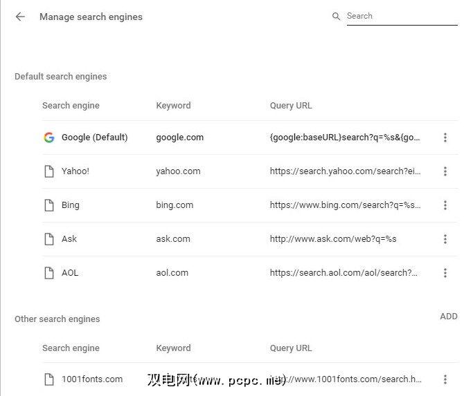 要开始使用,请右键单击Chrome中的多功能框,然后选择编辑搜索引擎强>。您会看到一个页面,其中包含您访问过的网站的默认搜索引擎(例如Google,Bing和AOL)以及其他搜索引擎。