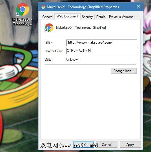右键单击此快捷方式,然后选择属性。在网络文档标签中,点击快捷键框,然后输入您要启动该网站的键组合。它必须以 Ctrl + Alt , Ctrl + Shift 或 Ctrl + Alt + Shift 开头。设置快捷方式后,单击确定。