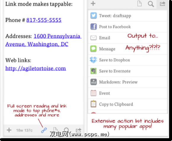 草稿是另一个快速的笔记应用,其中您可以直接给自己发送电子邮件(尽管这确实需要很多时间,但确实需要额外点击一下。)但是此应用程序更进一步,允许您将便笺发送到其他地方。例如Dropbox,Twitter,Facebook,Evernote,Day One,Pastebot等。