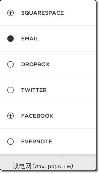 您还可以设置此记事应用程序,以将记事发送到您的Dropbox,Twitter,Facebook和Evernote帐户。但是,您在应用设置中选择的每个帐户都会将笔记发送给所有这些服务。因此,最好将一项服务设置为默认设置。如果您想发送到其他帐户,则需要先进行切换,然后再滑动以发送记事。 Squarespace Notes还会存档您的笔记,但不允许您附加照片或其他文件。