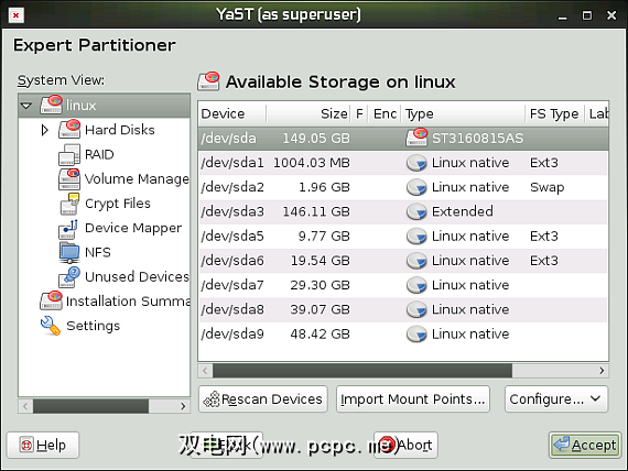 openSUSE的最好的两个功能是安装程序和 YaST控制中心。安装程序是一个图形向导,可引导用户进行简单的安装,并且还包含许多高级用户的高级选项。如今,许多发行版都在努力降低安装程序的数量,以适应新用户和正在迁移的Windows用户。