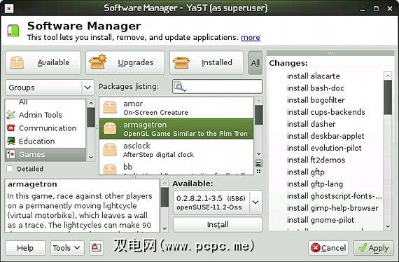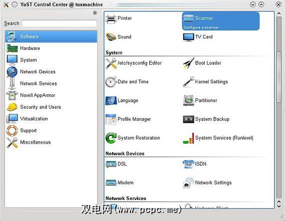 此外,从YaST可以备份和还原其系统,调整其Bootloader,设置用户,管理安全功能,设置虚拟化等。此外,YaST控制中心还是所有软件管理的集中式中心。虽然可以直接从菜单启动实际的软件安装程序,但YaST包括媒体配置,在线更新向导,附加产品设置,媒体检查和Webpin软件包搜索(搜索所有已知的openSUSE存储库,例如构建服务和社区贡献) )。