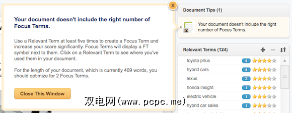 为文档打分,说明您使用关键字的程度如何,该评分在撰写时会不断更新。还提供有用的建议,例如您是否在写作中过度使用了关键字。