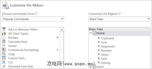 要访问功能区自定义选项,请选择文件>选项>自定义功能区。每个应用程序的设置将以相同的格式显示选项,并在左侧显示命令,并在右侧显示功能区内容。