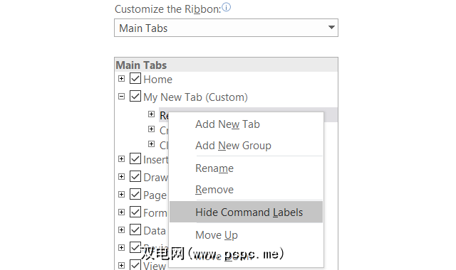 如果您是视觉思想家,或者只是喜欢图标而不是功能区中的文本,则可以轻松实现此目的发生。尽管您无法在主选项卡中的命令中隐藏文本,但可以对创建的包含命令的组进行隐藏。