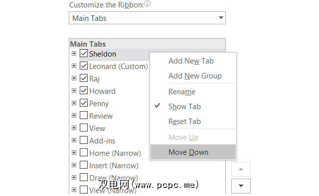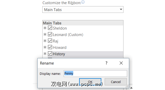 不仅可以重命名创建的自定义选项卡和组,还可以重命名内置的选项卡和组。假设您想将标签的标签更改为大爆炸理论上的主要角色名称,没问题。只需单击一下,就可以轻松到达Sheldon,Leonard,Raj,Howard和Penny。