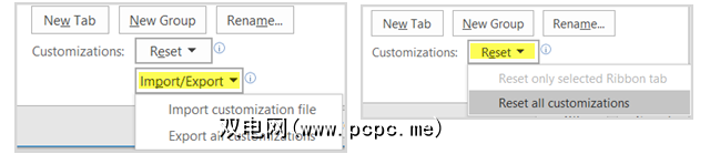 如果要将设置重置为默认设置,可以点击重置按钮。然后从仅重置所选功能区选项卡或重置所有自定义选项中选择,然后单击确定。