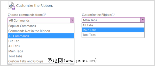 要自定义功能区的内容,基本上,您将左侧的选择命令列表和右侧的自定义功能区列表之间的项目。首先从两侧的下拉框中选择列表集。
