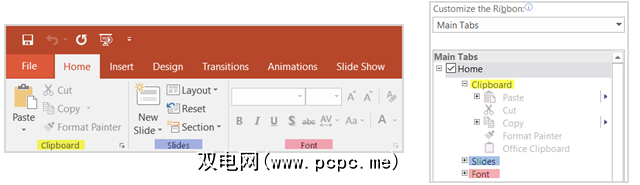 右侧的自定义功能区下列出的功能区内容旁边包括复选框和加号。复选框指示功能区中包含的内容,加号使您可以展开和查看包含的项目和操作。例如,在PowerPoint中,主页选项卡当前包含剪贴板命令及其可用操作。