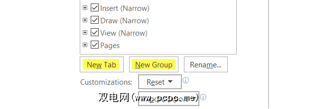 向其中添加命令和标签功能区很简单,但是您可以沿相反的方向移动项目。首先,使用底部的相应按钮在现有选项卡中或完全在新选项卡中创建一个新组。