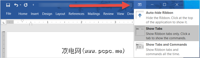 要隐藏或显示功能区,请单击以下区域右上方的功能区显示选项按钮。你的申请。然后,将有三个用于色带显示的选项:
