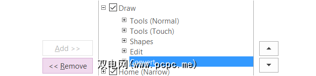 下一步,您可以取消选中右侧不再需要在功能区中显示的任何项目。例如,如果您不再需要OneNote中的“绘图"选项卡,则取消选中绘图旁边的框,然后单击确定。对于带有加号的项目,您可以添加或删除单个项目。因此,如果您希望在我们的示例中保留“绘制"选项卡,但包含“转换"以外的所有动作,则可以轻松删除它。只需选择转换,点击中间的删除按钮,然后选择确定即可。