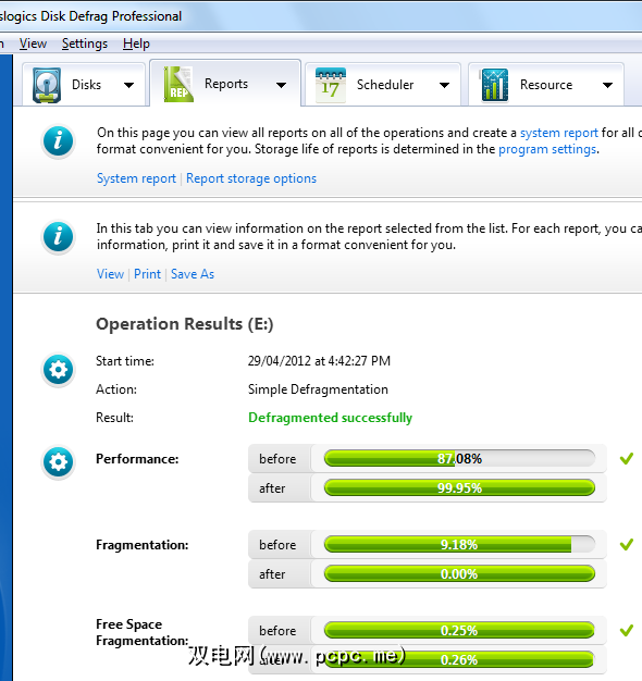 碎片完成后,您可以在“报告"选项卡上查看详细的碎片报告。