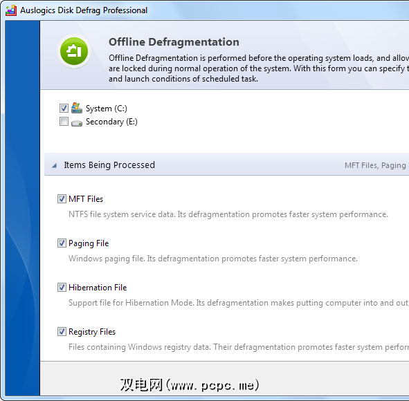 Disk Defrag Pro也可以执行脱机碎片整理。当您激活脱机碎片整理时,Auslogics Disk Defrag Pro将在您下次启动计算机时(在Windows启动之前)运行。这使应用程序可以对Windows使用的系统文件进行碎片整理,包括页面文件,休眠文件和注册表文件。