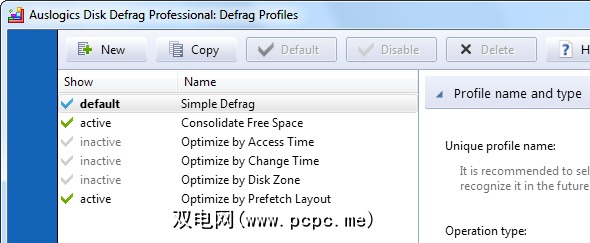 默认情况下,Auslogics磁盘Defrag Professional使用“简单碎片整理"配置文件。此配置文件是最快的,因为它只会对文件进行碎片整理,并且对其在磁盘上的布局没有任何特殊作用。但是,它还包含许多其他配置文件-例如,您可以将其布置为文件以最大程度地释放可用空间。