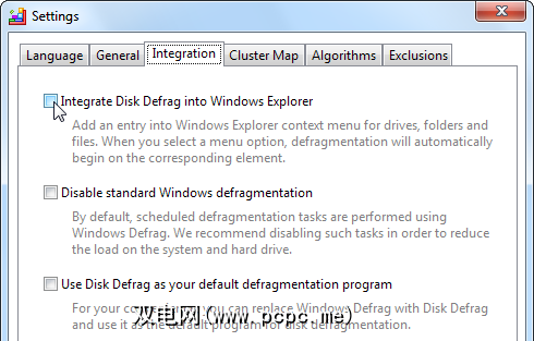 如果您拥有某些东西(例如游戏文件夹),则希望快速整理磁盘碎片而无需花费更长的时间碎片整理过程中,可以对特定文件或文件夹进行碎片整理。 Windows Explorer集成允许您从其右键单击菜单中对文件进行碎片整理,从而使此操作变得更加容易。要启用此选项,请单击“设置"菜单,然后选择“程序设置"。您可以在“集成"选项卡上找到此选项。
