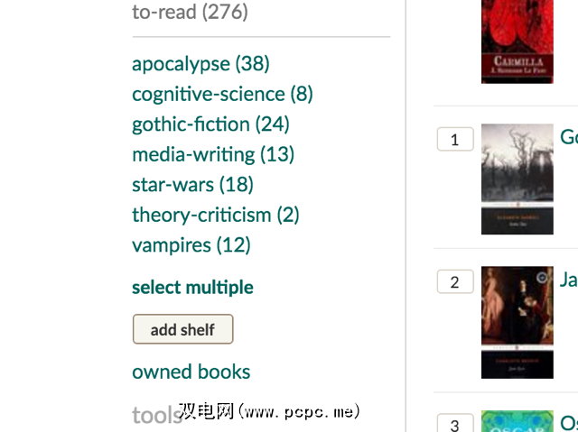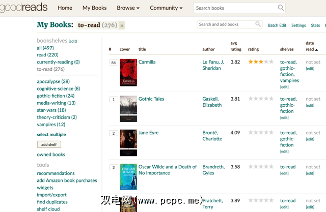 大多数阅读清单上的书都属于很多不同的类别。例如,我自己的列表中包含很多科幻小说,但同时也包含历史,真实犯罪和世界末日。如果我接下来想阅读特定的流派,我可以轻松地使用Goodreads按书架进行排序,这样我就只能看到特定的书籍子集。