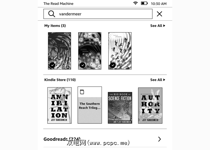 在书本上带有书本图标的项目在您的Kindle上,在搜索词中带有购物车的旁边它将为您搜索Kindle商店。您还可以选择“随处搜索"选项以查看图书馆,Kindle商店,Goodreads和其他地方的结果。