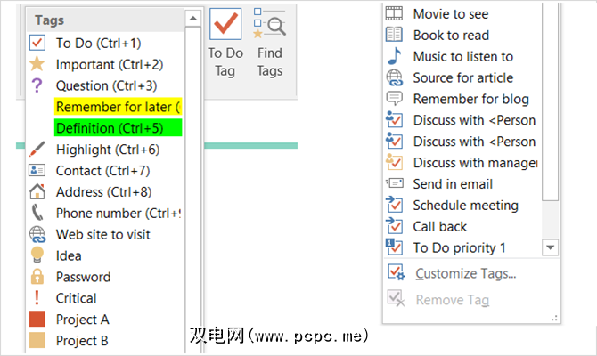 在主页选项卡上,您将看到名为标签的部分。 。单击“标签"框中的箭头时,可以查看内置选项的完整列表。从简单的优先级排序到后续的构想,书籍和电影,您都可以从一个不错的选择中进行选择。