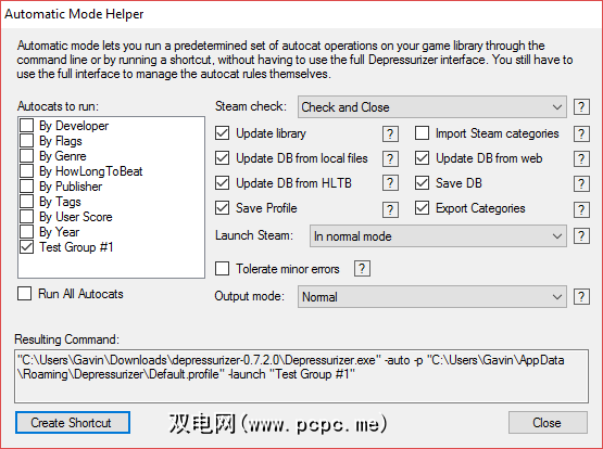 自动模式帮助器是Depressurizer类别的快捷方式和命令行向导。您可以与其他工具一起创建类别组合,以直接从命令行或快捷方式运行,而不必启动主应用程序。