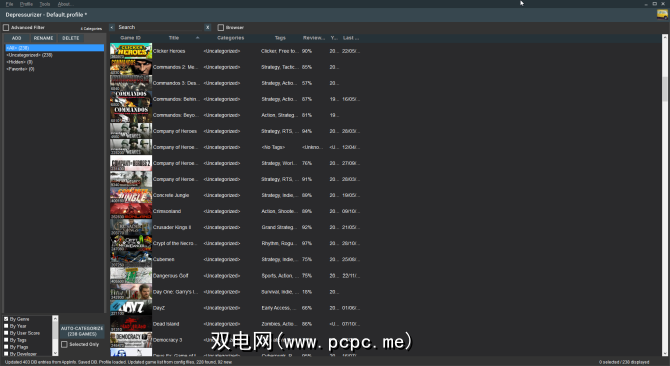 让我们从Depressurizer界面开始。它看起来有点像您的Steam库,但具有更多自定义选项。左侧面板包含您的类别。 类别面板下方是快速自动分类部分。您可以使用Depressurizer预设之一自动对游戏进行排序(我将在稍后对其进行扩展)。