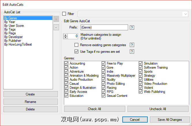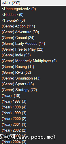 让我们采用自动年份类别。回顾我们的第一次试用,我们的Steam库产生了一个每年列出的类别列表。从AutoCat列表中选择按年份。在分组下,选中到十年前,然后保存所有更改。