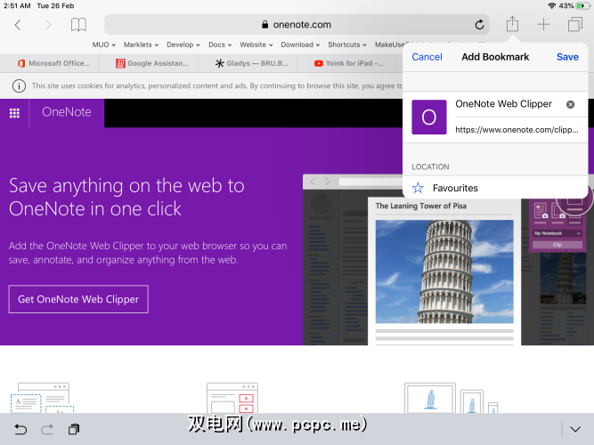 要创建小书签,请点击共享>添加到书签以制作新的书签。将标题设置为 OneNote Clipper 。保留地址字段不变,将书签的位置设置为收藏夹,然后点击保存。