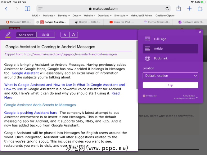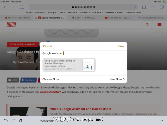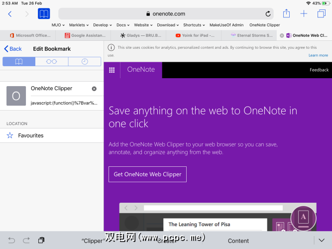 有一种方法可以复制适用于iOS的桌面OneNote Clipper扩展。为此,我们将为Safari设置OneNote iOS小书签。