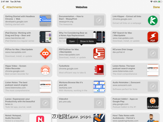 研究结束后,您可以快速浏览通过附件浏览器添加的网络链接。该按钮位于注释列表的左下角。如果您添加了十几个或更多链接,并想知道它们在注释中的实际位置,请点击并按住该链接,然后选择在注释中显示。