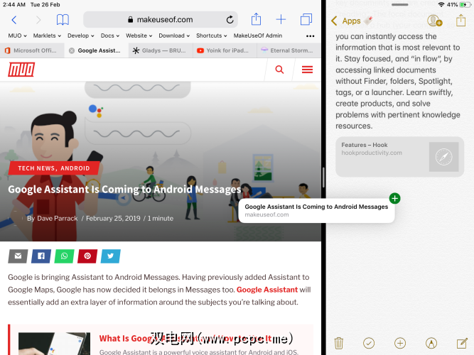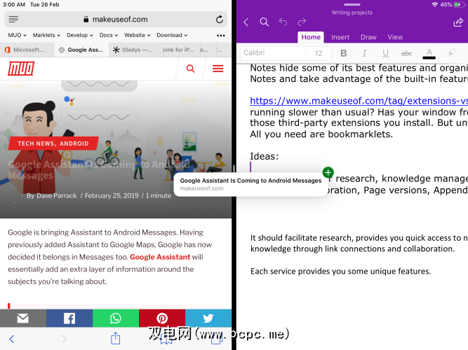 您甚至可以将两个应用并排放置在“分屏"模式下。使用此功能,您可以将Notes应用程序停靠在Safari旁边,然后将链接,文本或图像从Safari拖放到Notes中。
