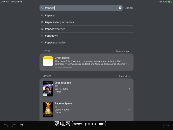 如果您使用标签来组织笔记,请在#标签上注释的开头或结尾,以便以后轻松查找。向下滑动以打开Spotlight,然后输入标签以及搜索词。 Spotlight会搜索您的笔记,并在笔记中将标签精确定位到它们的实际位置。