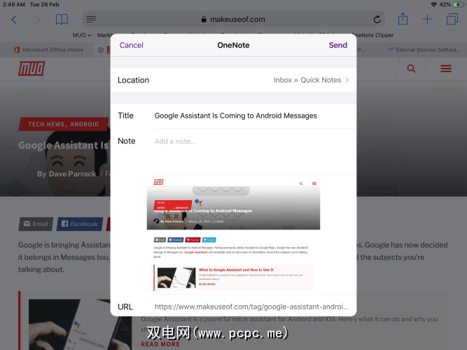 要添加网页,请点击共享按钮,然后选择 OneNote 。在出现的弹出窗口中,选择一个位置,添加标题(如果需要,还可以添加注释),然后点击发送。 OneNote会在页面上添加一个链接和该文章的屏幕快照。