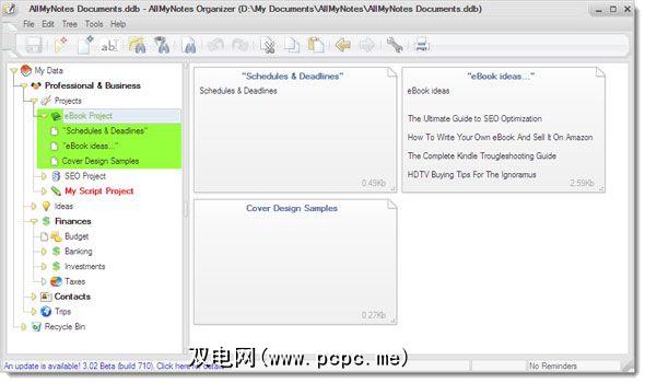 AllMyNotes Organizer可让您为文件夹着色并分配图标(图库数量为56)以进行标记,从而提高了组织效率您的文件夹。文件夹预览使您对内容有所了解。如果将任何数据组织为一个项目,则还可以添加复选框并将其转换为任务。设置提醒和警报,您可以给您的项目一个时间范围。信息进入应用程序。 AllMyNotes Organizer使它稍微容易一些,因为您可以使用系统托盘图标中的选项将其捕获到程序中。 JPEG,PNG和GIF文件也可以插入到便笺中。您可以从Evernote,Info Select,RoboForm,KeyNote,Lotus Notes和TreePad等应用程序的大杂烩中导入数据。