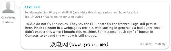 我不是那么容易推迟,而是只是希望公司承认有问题,并且修复程序将到达。就在我写这篇文章的那一刻,在这些部门中的任何一个方面,10.8.2的发布都几乎没有改善,尽管电池寿命明显得到了改善,UI滞后和声音卡顿仍然持续。