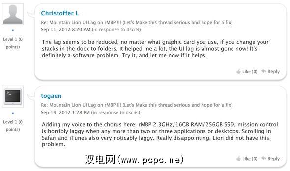 社区一直在深思与图形滞后有关的问题可能是,有人暗示应该归咎于专用或集成的图形芯片驱动程序,而另一些人则声称Mountain Lion的运行要比Lion低得多,这是由于调低了的风扇来帮助语音指令更清晰地拾取声音以及一些有趣的理论(某些动画)
