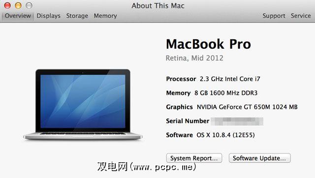 如果您有一台旧Mac,但是不确定它到底有多旧,则可以通过单击屏幕左上角的Apple徽标来找到,然后选择< em>关于本机并在出现的窗口中更多信息... 。出现的窗口还显示了型号(黑体,顶部),以及生产年份和基本硬件规格。