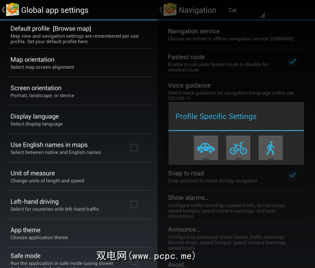 返回 Settings 菜单,转到 Navigation 为汽车自定义个人资料,自行车或行人导航。您可以选择在线或离线导航服务以及各种地图行为。确保选择语言包以启用语音指导。