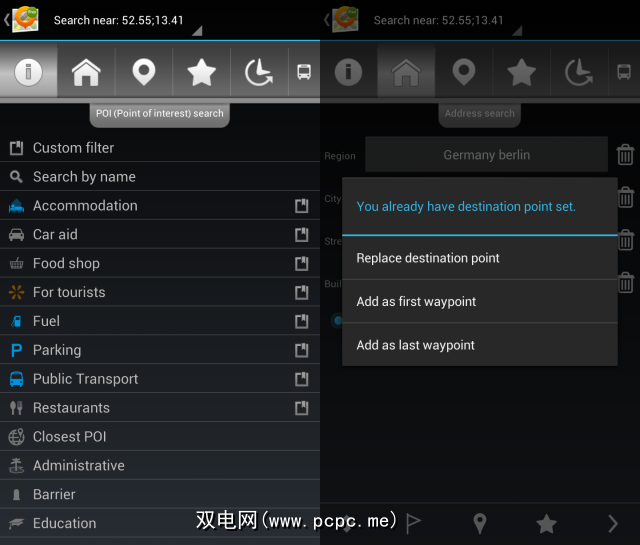 返回到开始屏幕,然后选择搜索。您可以在六种不同的搜索模式之间进行选择:POI(兴趣点),地址,坐标,收藏夹,历史记录和交通方式。要导航到特定位置,请点击房屋符号并输入区域,即您下载的地图,城市和街道之一。找到目的地后,您可以立即导航到该目的地,将其设置为目的地或航点,在地图上显示它,或者通过底部的相应图标将其添加到收藏夹中。