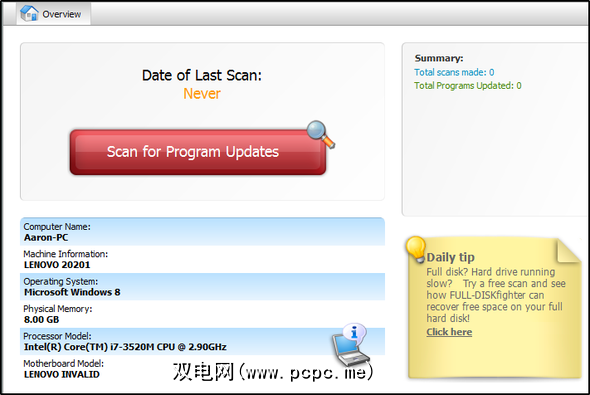 左侧的 Home 标签仅提供上次扫描的概述,总扫描与更新的总程序的摘要以及一些设备信息,例如计算机名称,操作系统,处理器型号等。它还包括一个易于访问的红色按钮,用于通过它开始新的更新扫描。