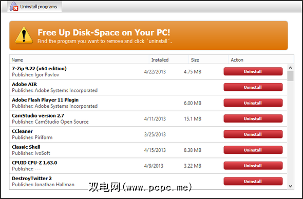 第三个选项卡在标题为 Uninstall 的“出租"面板中,您可以查看计算机上安装的所有程序,并包括诸如软件发布者,安装日期和程序大小等信息。您可以通过单击红色的卸载按钮轻松地卸载任何程序。不幸的是,目前没有“批量卸载"选项。