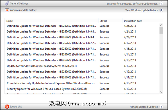 设置标签包含常规设置, Windows更新历史记录和< em>忽略列表。