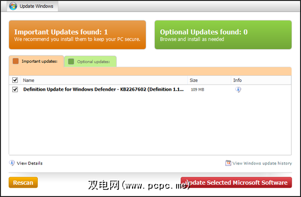 OUTDATEfighter还可以方便地更新Windows。点击左侧的更新Windows 标签。主屏幕分为两个选项卡:重要更新和可选更新 –与标准Windows Updater一样。在更新的每一行中,都有三列:名称,大小和 Info 。 信息列中有一个图标,您可以单击该图标提供有关更新的更多信息。