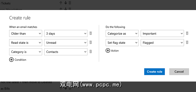 高级规则允许用户创建多种“假设的情况",以更好地度过每天收到的成群的电子邮件。微软给出的示例是:“ 如果未读电子邮件的时间超过3天并且来自您的某个联系人,则将其标记为重要并标记。"