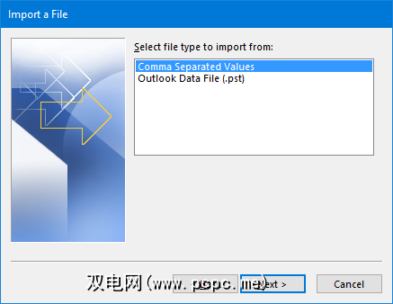最后,打开Microsoft Outlook并转到文件>打开和导出>导入/导出 。选择从另一个程序或文件导入,然后单击下一步。依次按照向导操作,以获取逗号分隔值(这是您的联系人列表),然后再次浏览向导 Outlook数据文件(.pst)(您的电子邮件)。